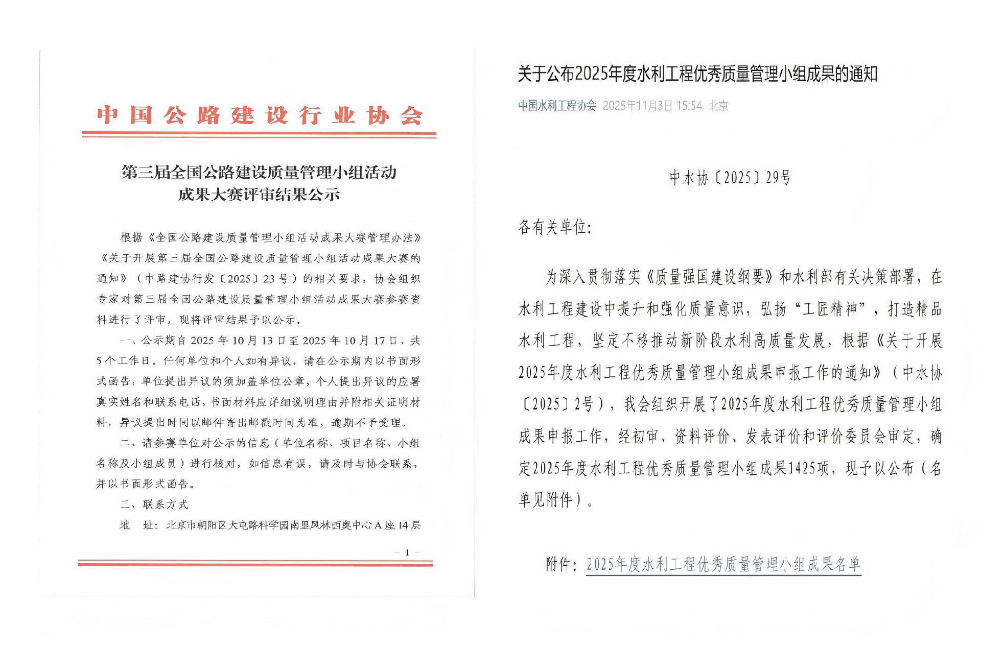近日,中國公路建設(shè)行業(yè)協(xié)會、中國水利工程協(xié)會先后公布了第三屆全國公路建設(shè)質(zhì)量管理小組活動成果評審結(jié)果和2025年度水利企業(yè)質(zhì)量管理小組競賽活動結(jié)果?!啊ぁぁ?/p>
