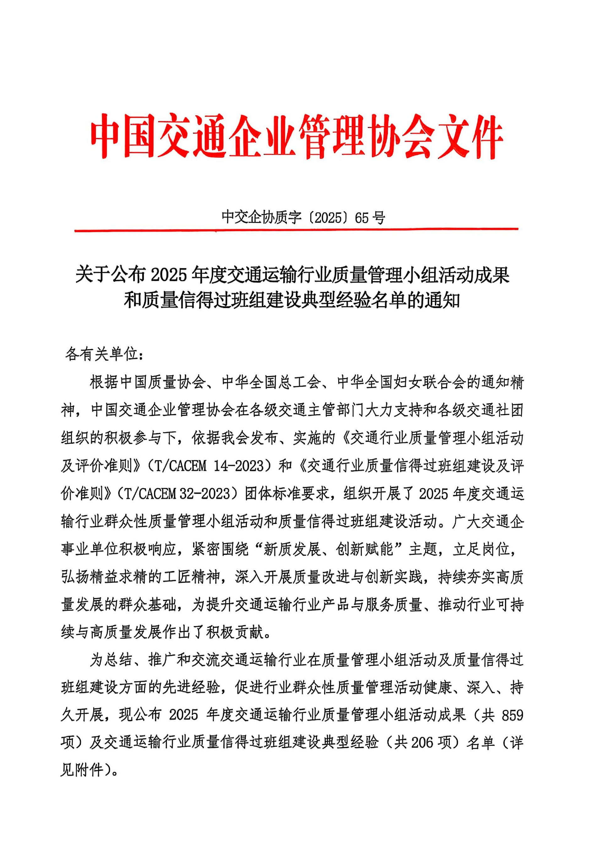 2025年11月20日,中國交通企業(yè)管理協(xié)會公布了年度交通運輸行業(yè)質(zhì)量管理小組活動成果獲獎名單。開發(fā)路東延快速化改造工程“瑞沃···